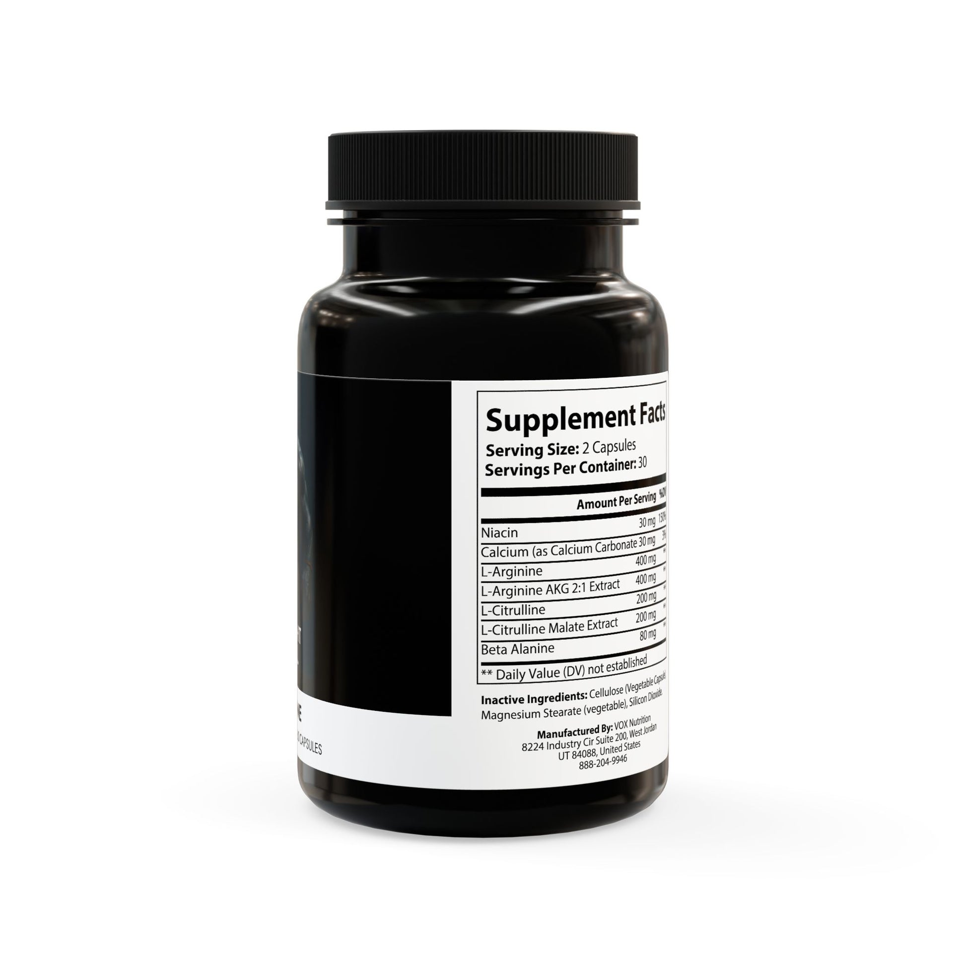 Ingredients: Niacin, Calcium, L-Arginine, L-Arginine AKG 2:1 Extract, L-Citrulline, L-Citrulline Malate Extract, Beta Alanine. Inactive Ingredients: Cellulose (Vegetable Capsule), Magnesium Stearate (vegetable), Silicon Dioxide.